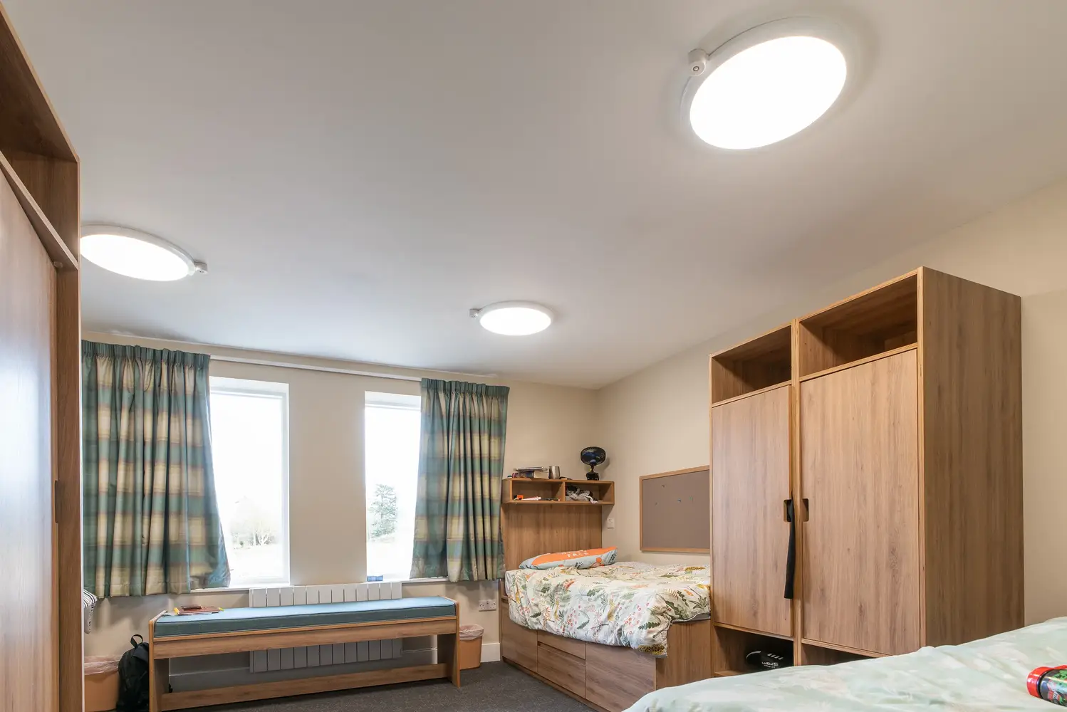 Lighting in the bedrooms uses slim, semi-recessed Dot luminaires, with recessed Flexblox downlighters in the communal TV lounge. The new Firefly emergency luminaire has been used throughout, combined with Lexi illuminated exit signs to provide completely reliable escape lighting in the event of a power failure. The building exterior is lit with wall-mounted Realta luminaires, and pathways are illuminated with Passway bollard luminaires and pole-top Starbeam Eco floodlights.