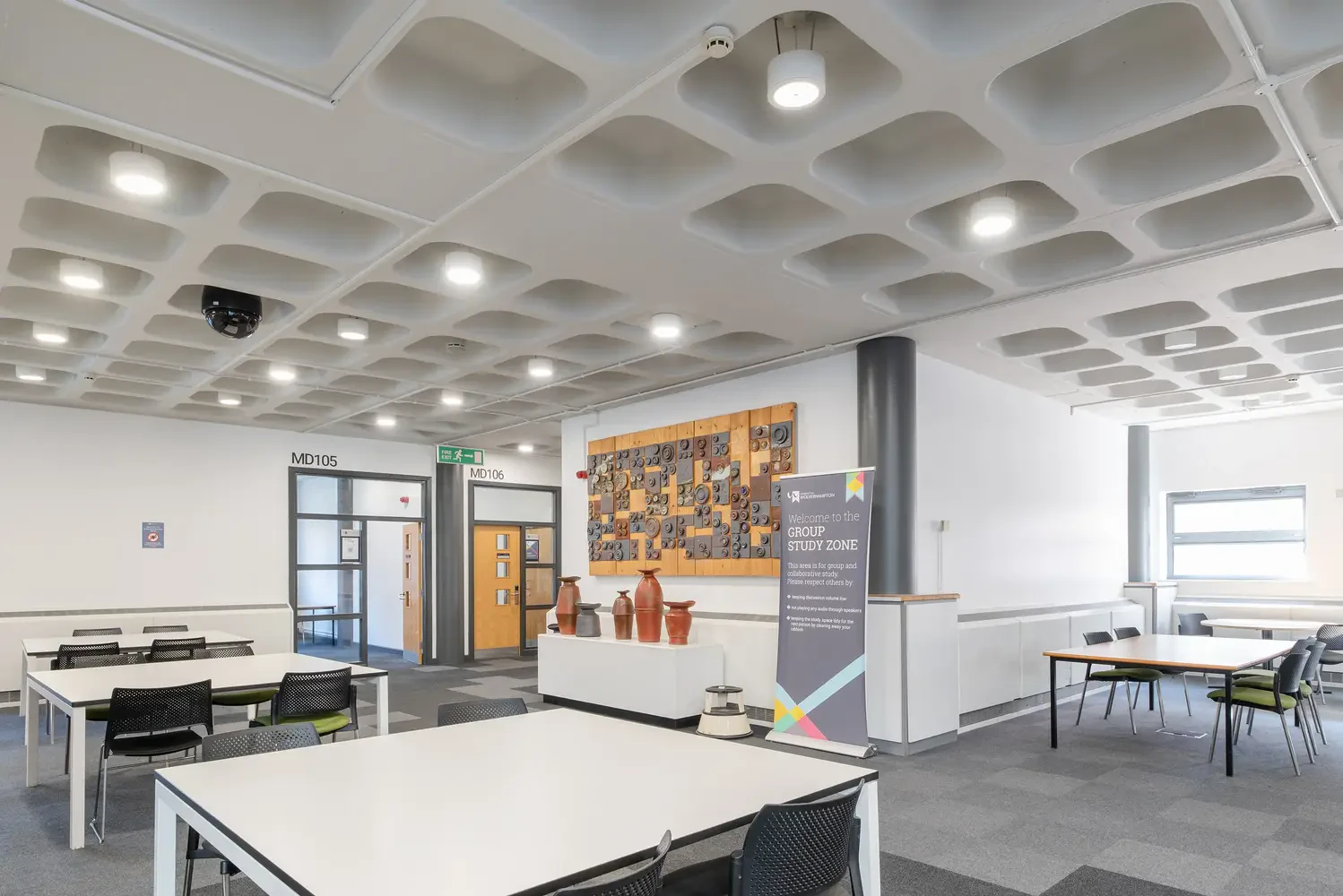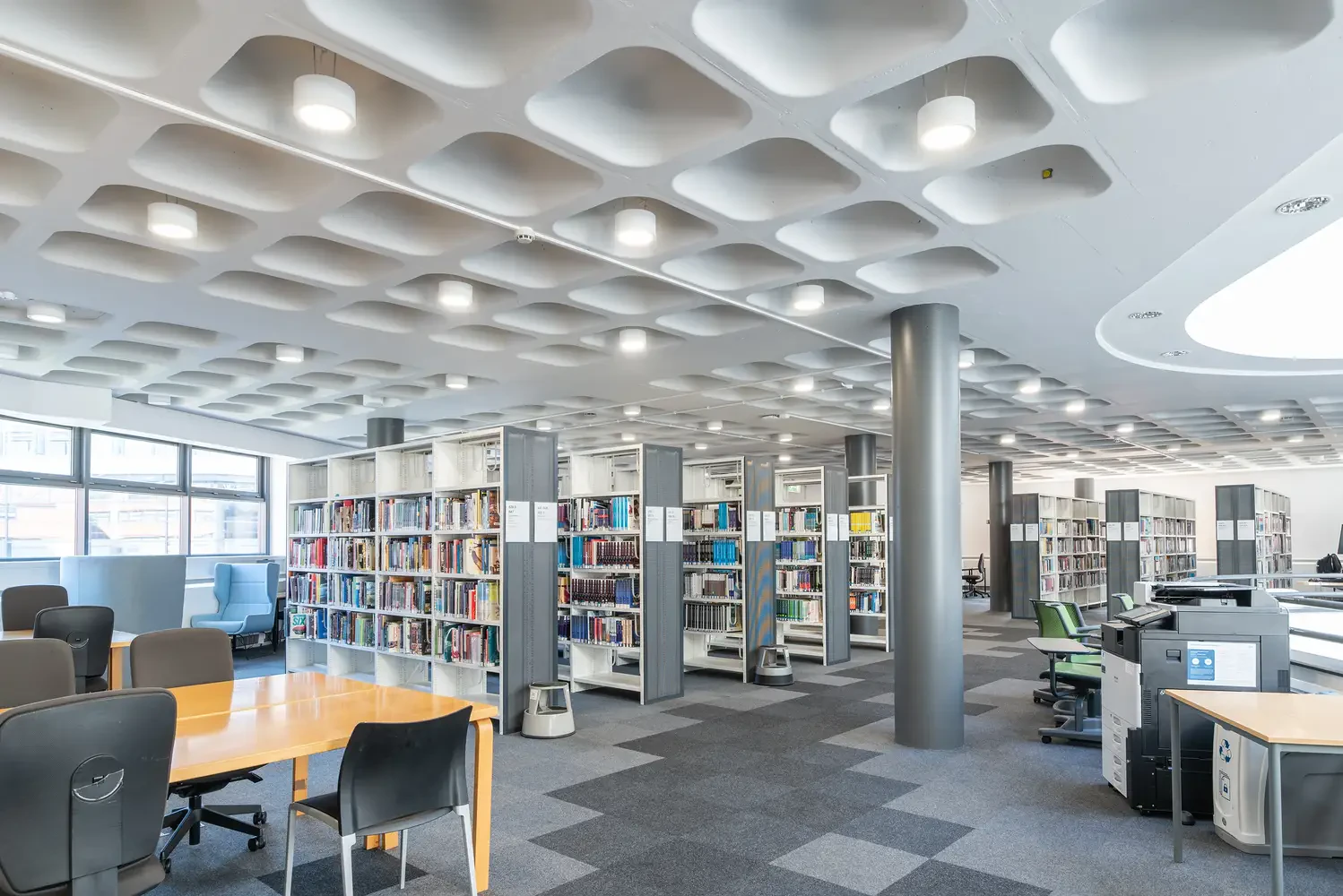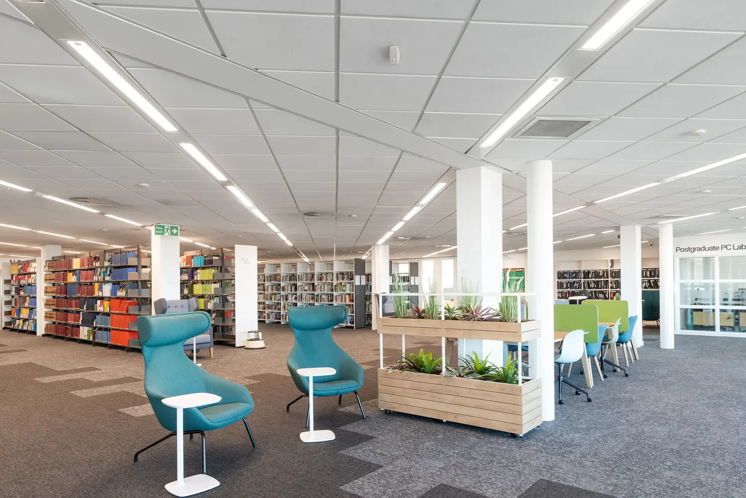 In recent years, the University has invested £125 million in improvements across its various sites. This has included a £1.6 million refurbishment of its largest library facility, the Harrison Library, located on the main campus in the city centre. Besides improving study areas and adding learning zones and meeting rooms, the library has upgraded from outdated, inefficient fluorescent luminaires to an energy-saving, SmartScan-controlled Thorlux LED lighting system.