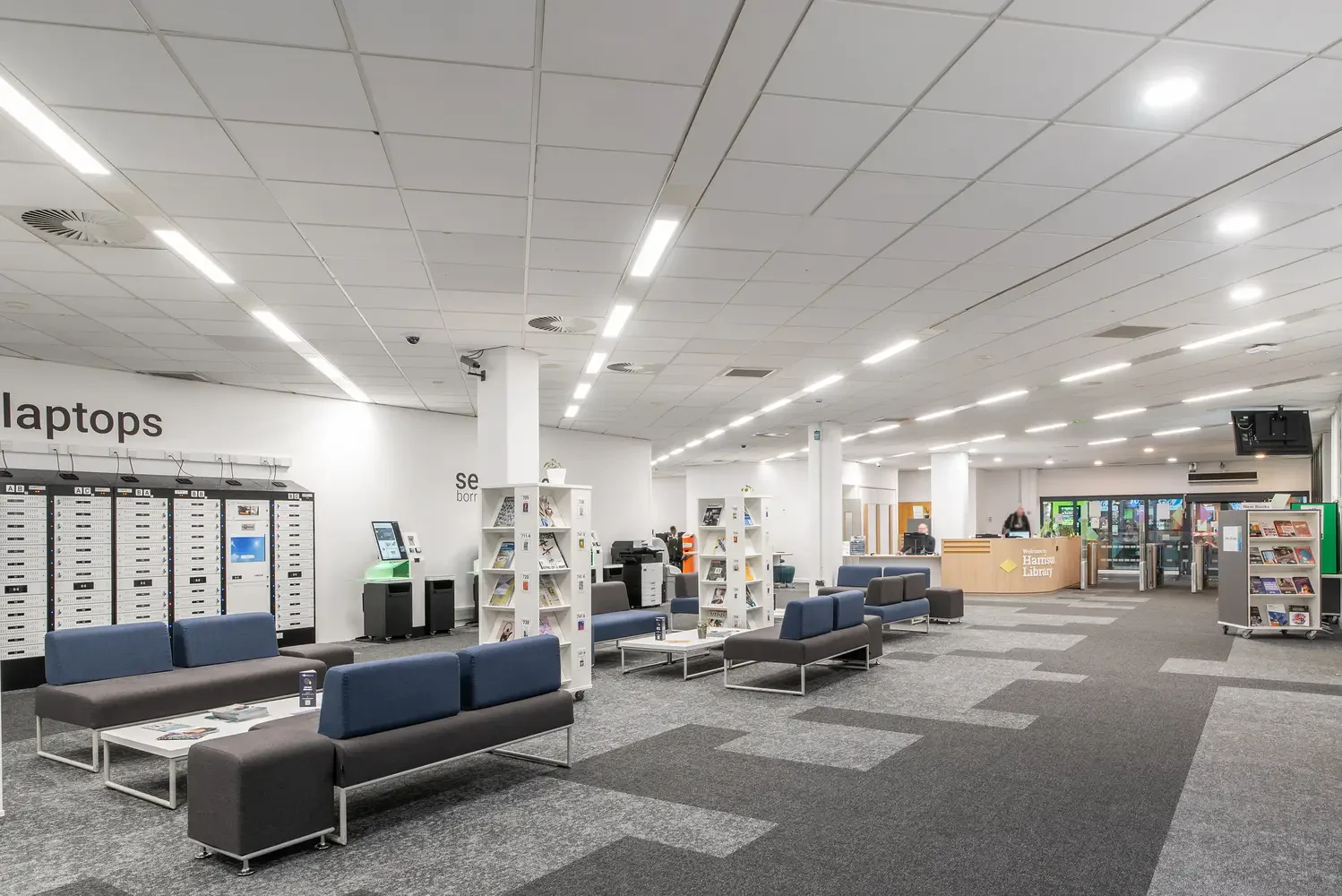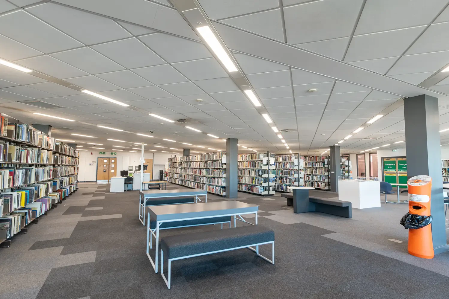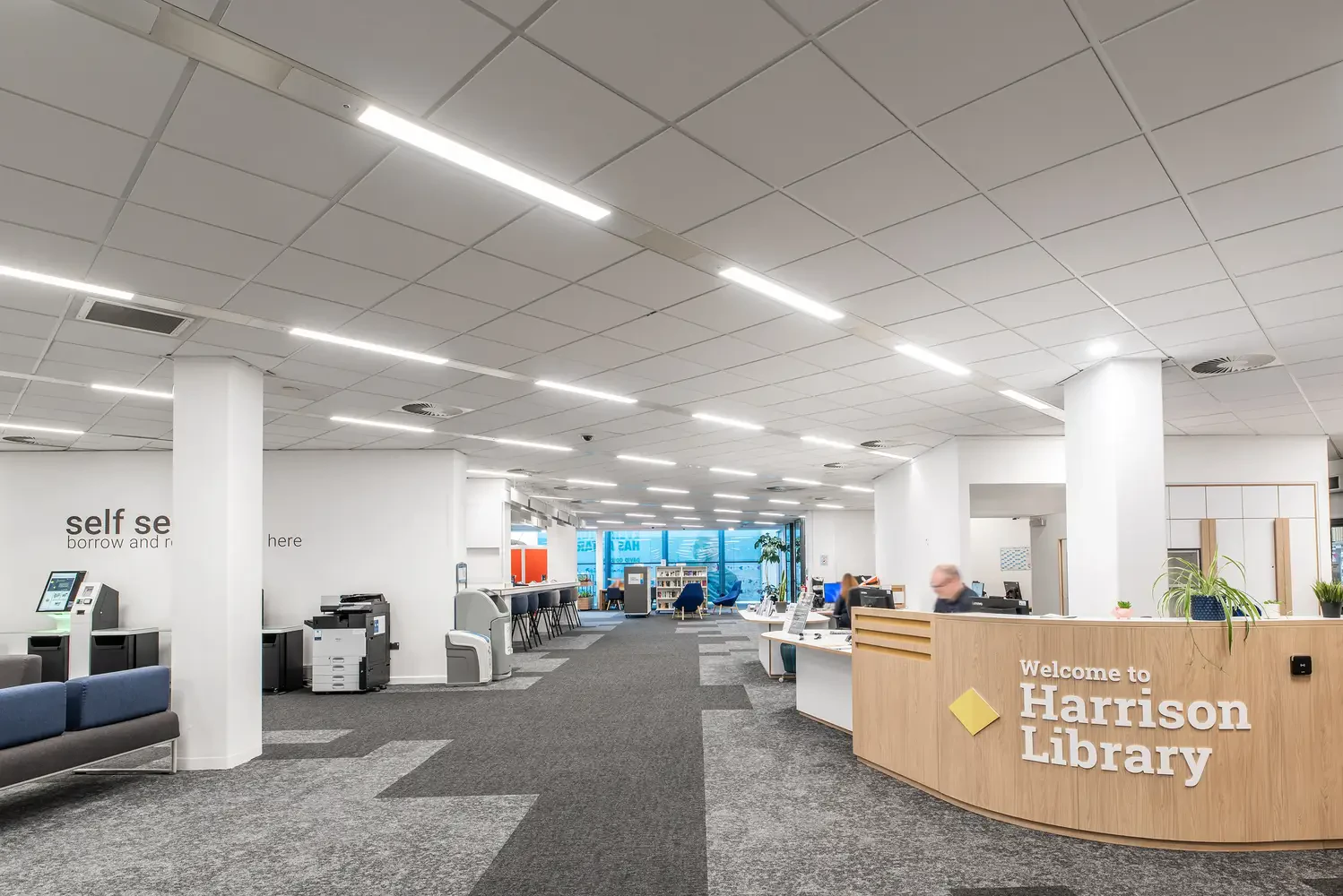 The new system has reduced lighting energy consumption at the Harrison Library by 84% annually, saving more than £63,500 and reducing CO₂e emissions by over forty-five tonnes each year.
